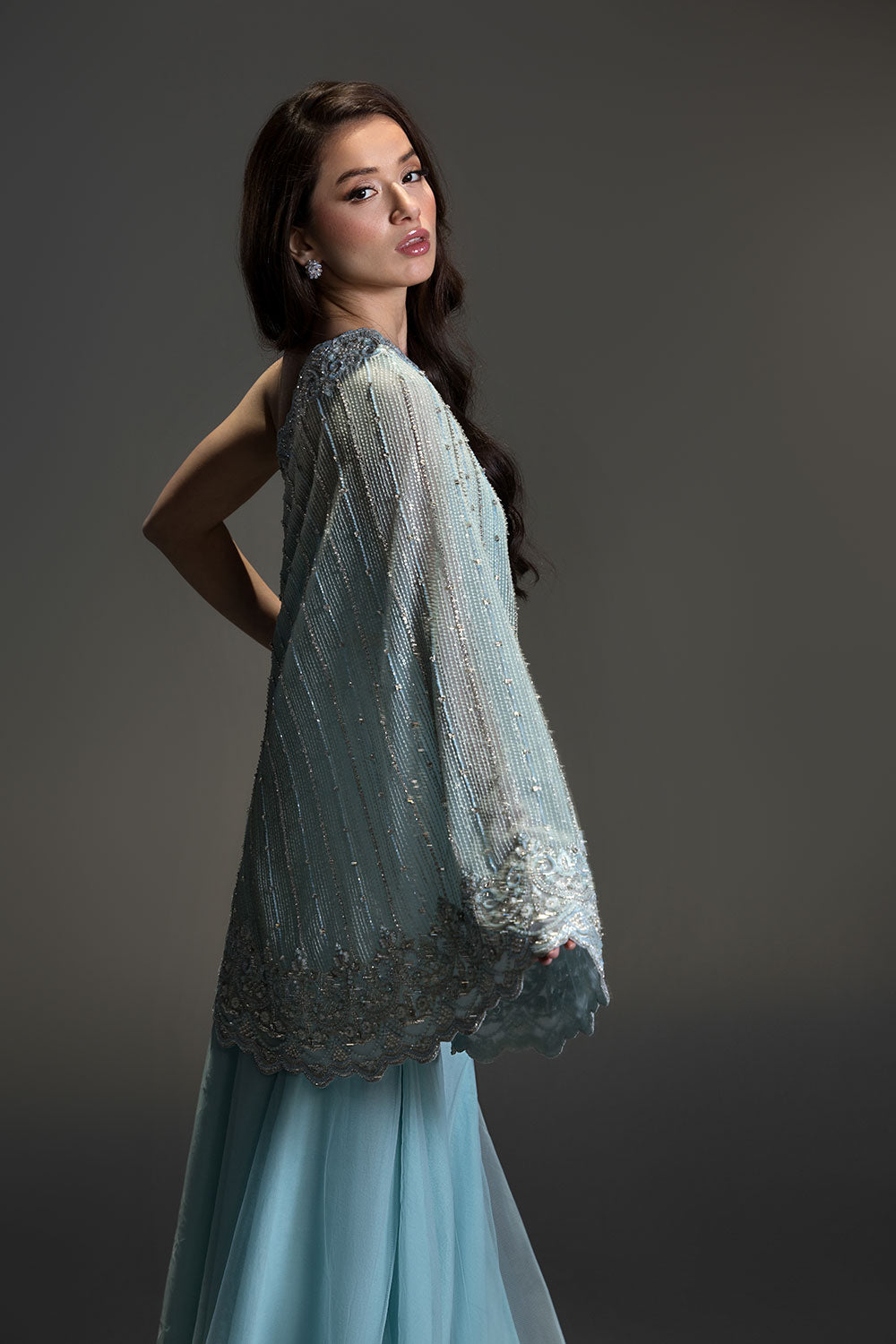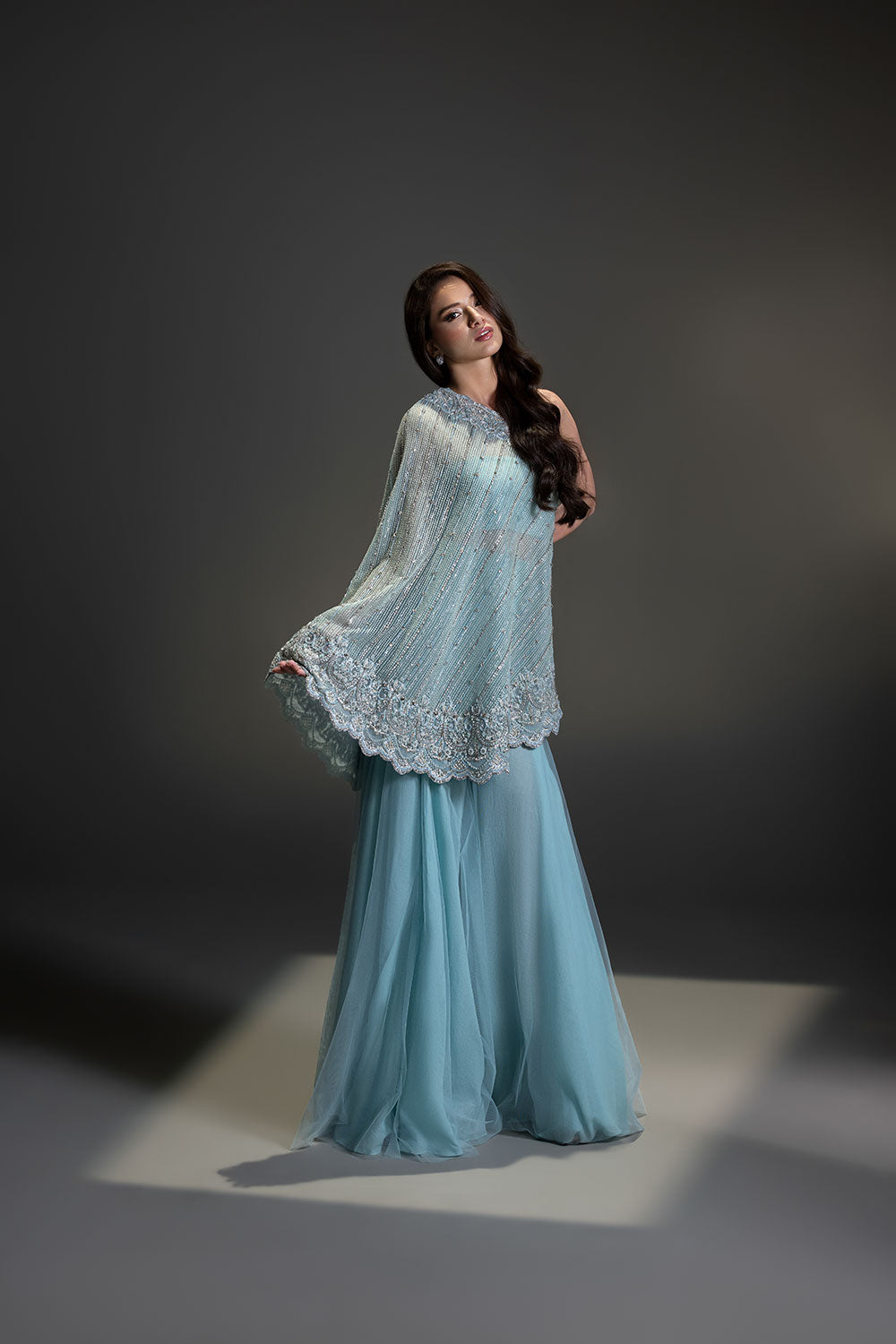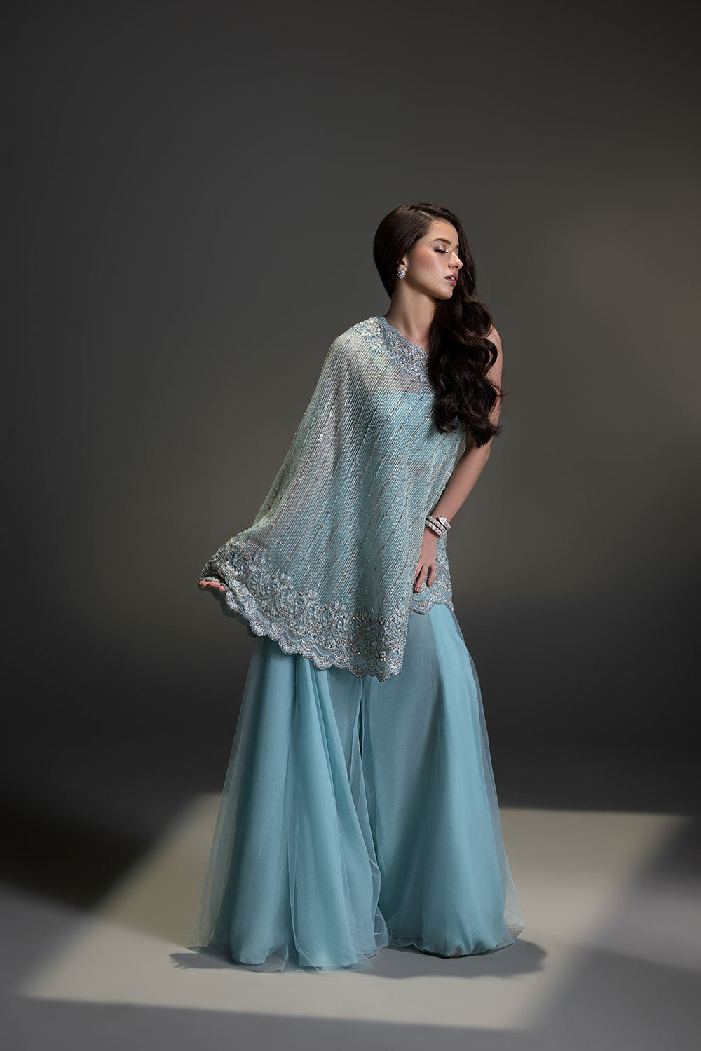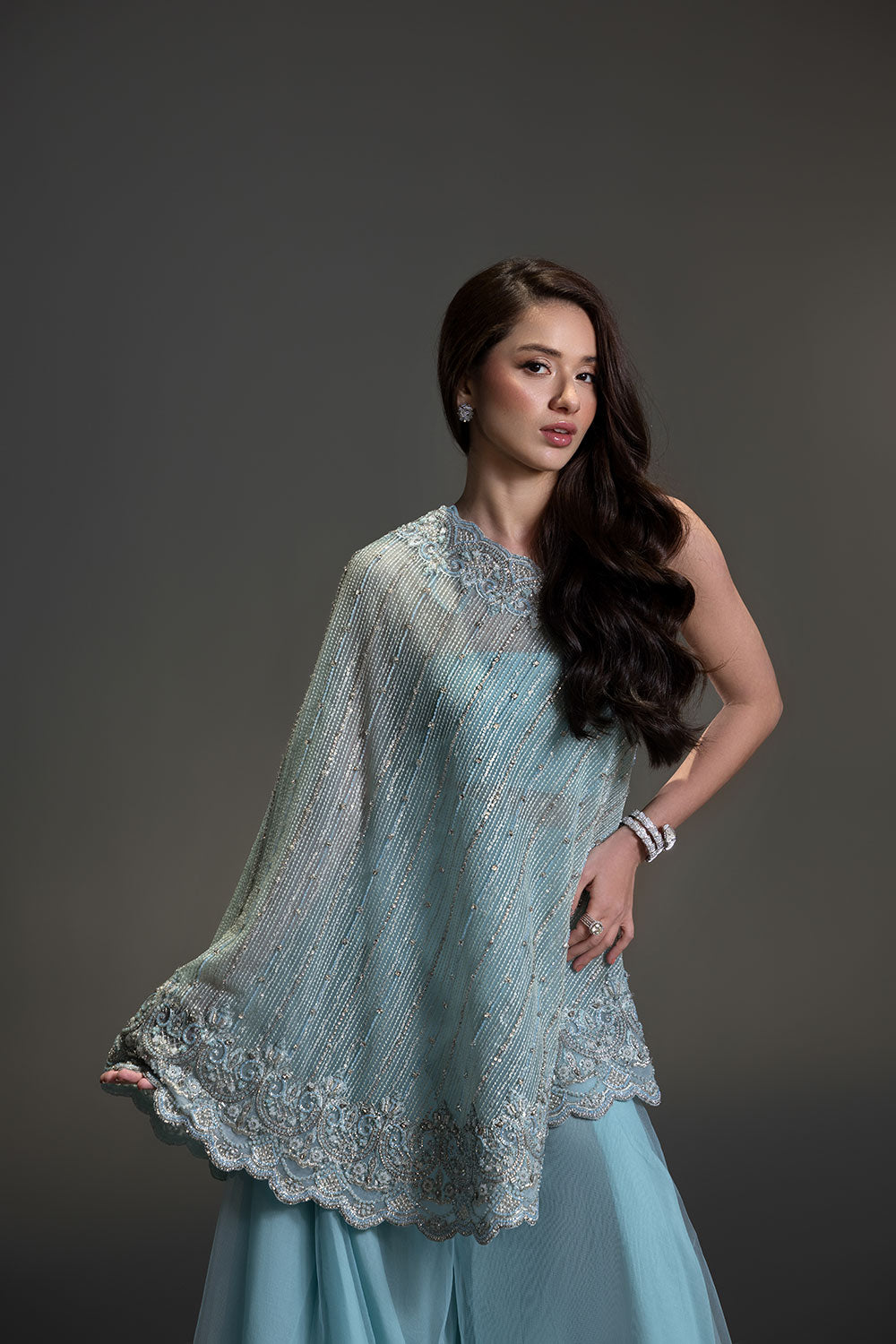 A contemporary silhouette brought to life with hand-placed crystals and beads, featuring a modern pochos styled with a flowing two-legged sharara.