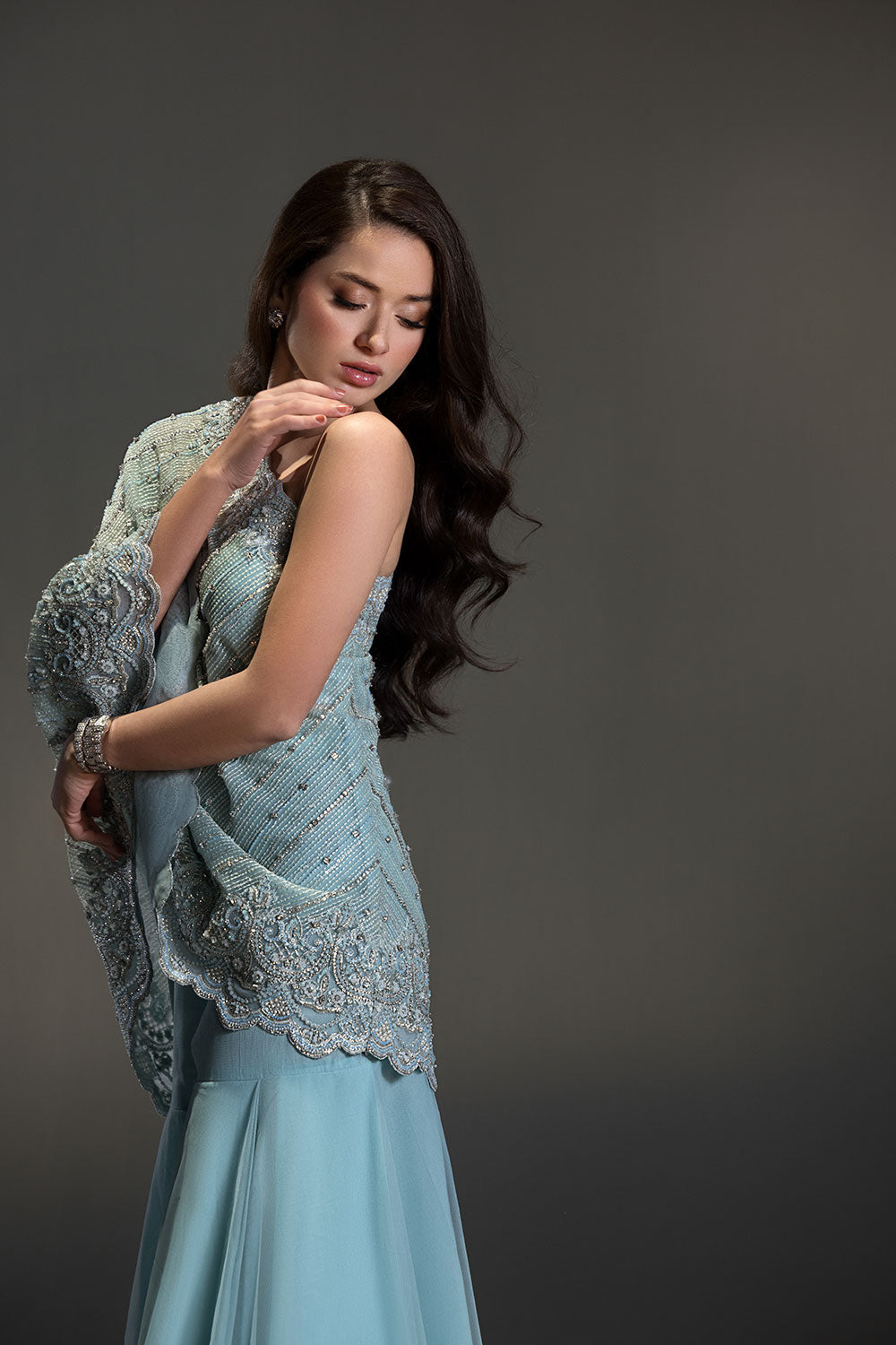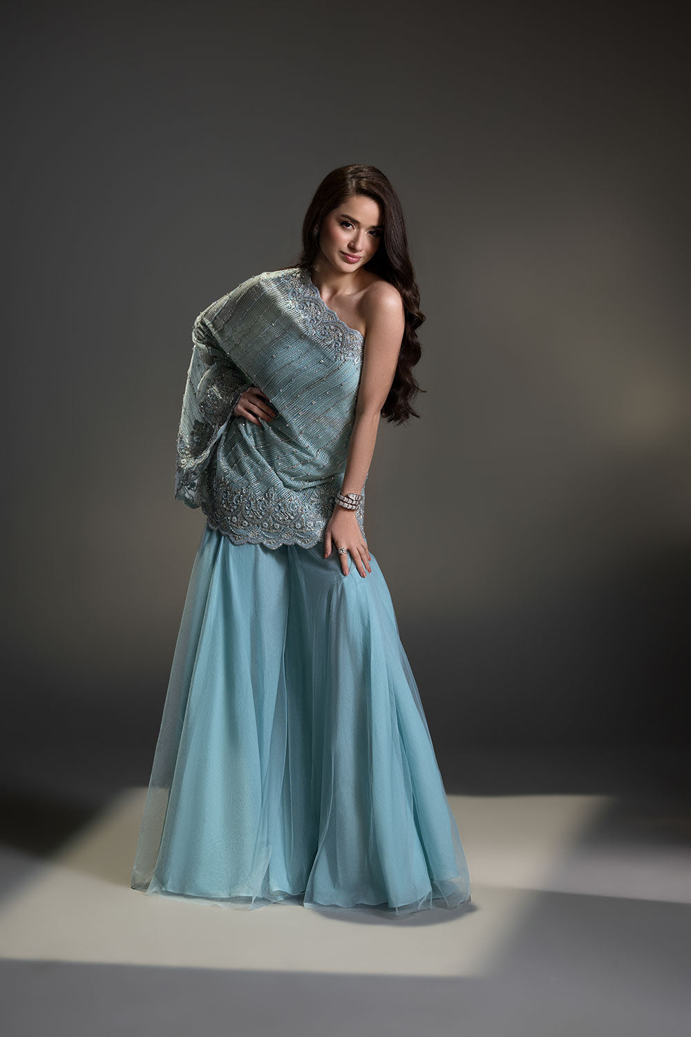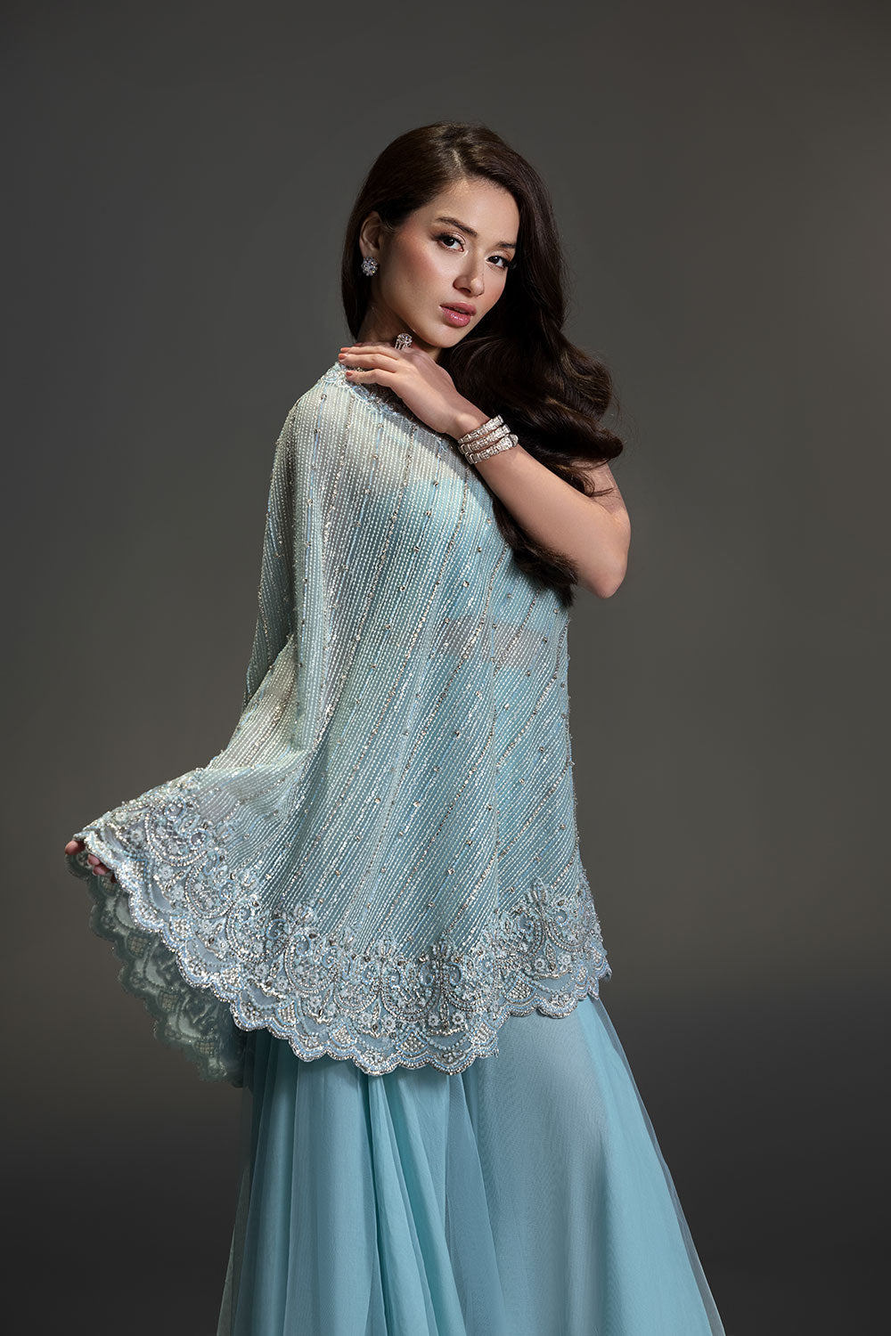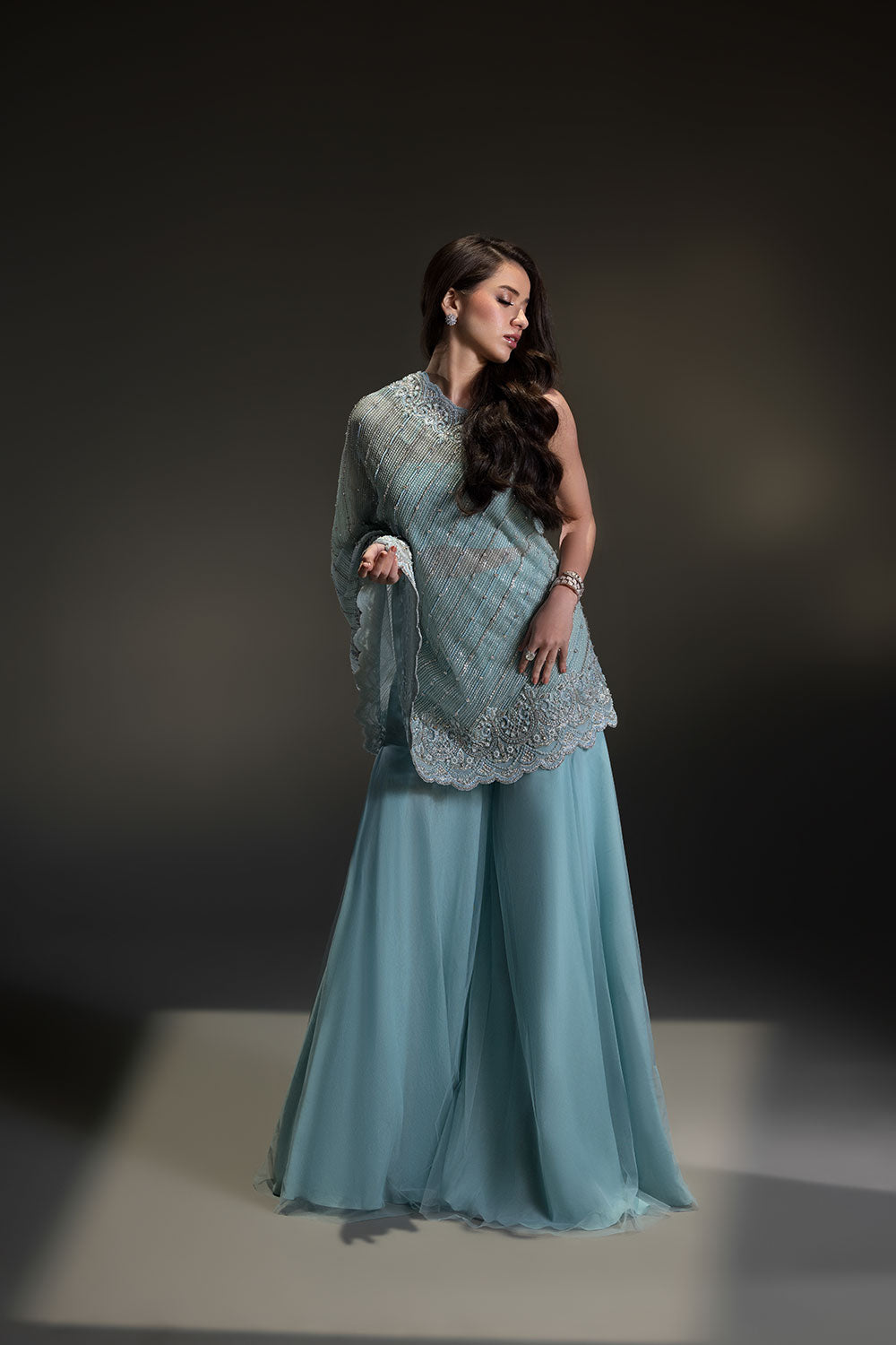 A contemporary silhouette brought to life with hand-placed crystals and beads, featuring a modern pochos styled with a flowing two-legged sharara.